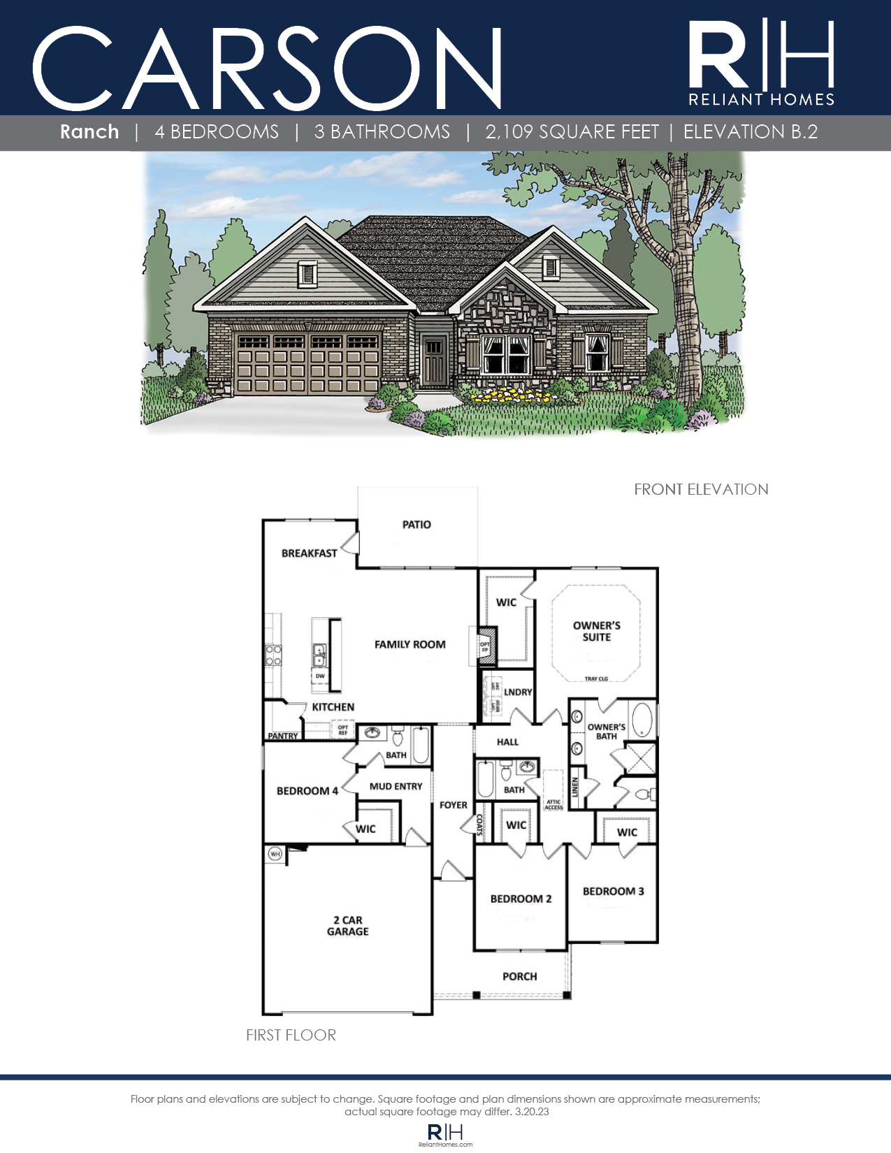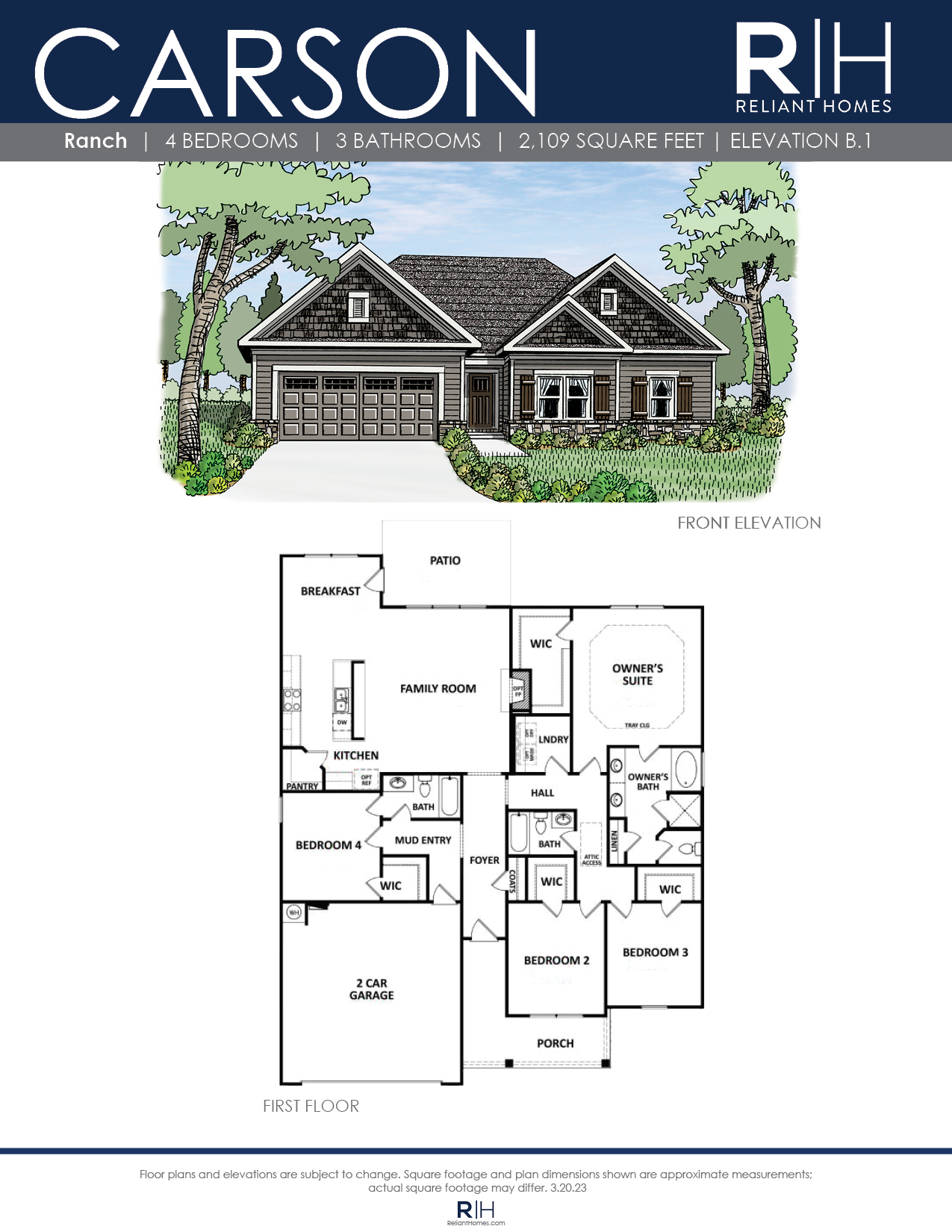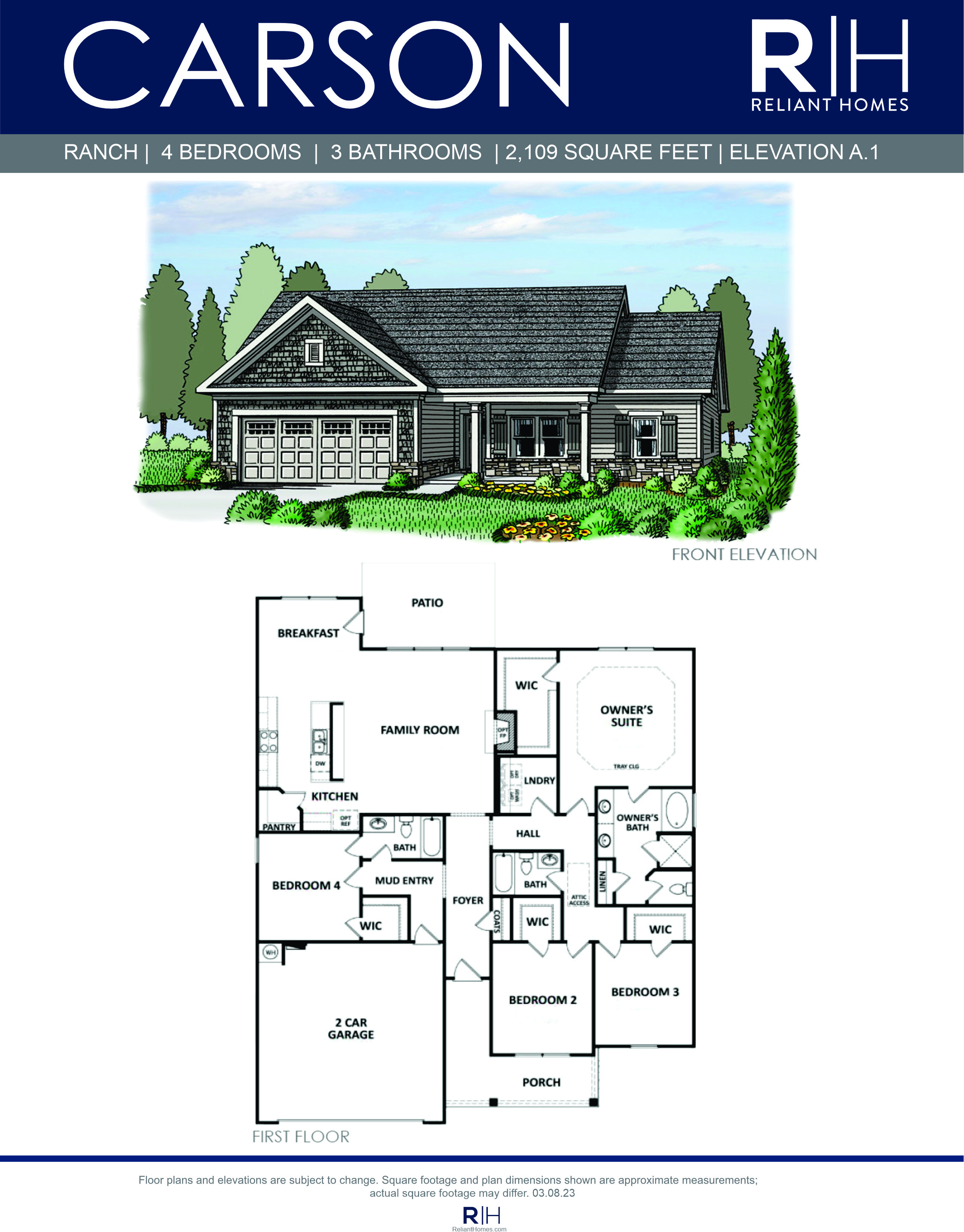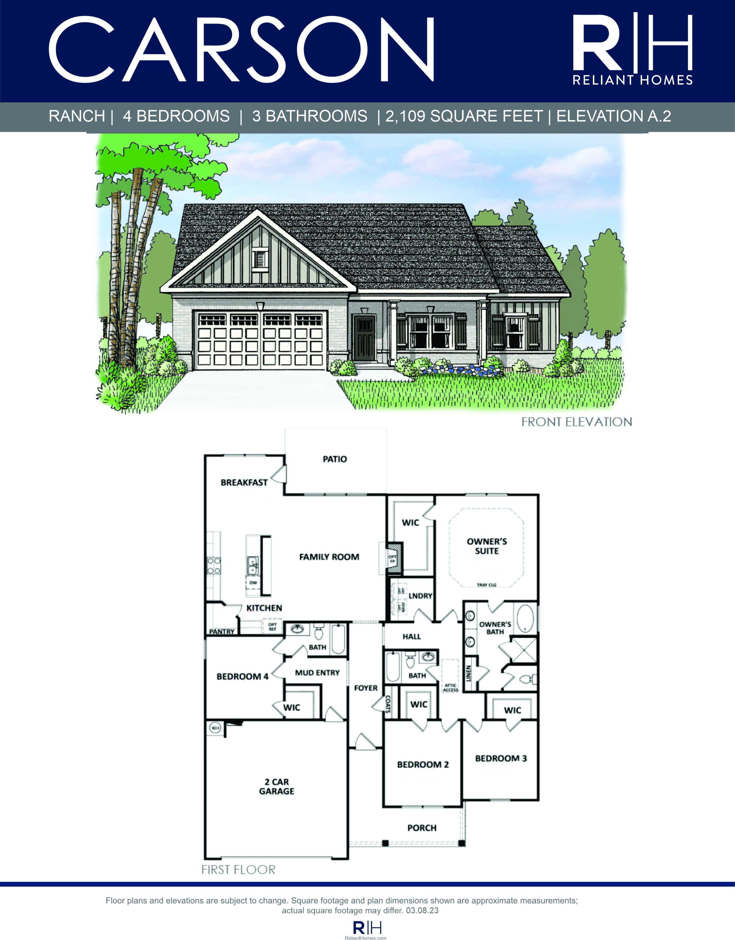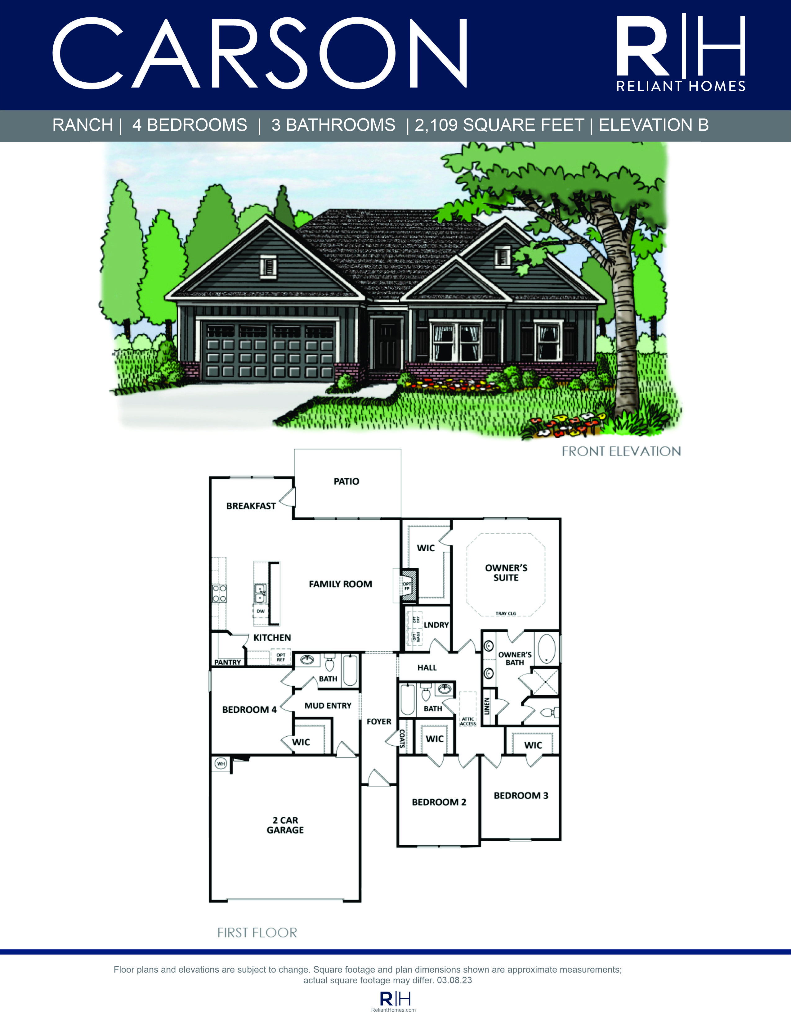 Exceptional ranch home with a 4 bedroom design that features a guest room with full bath plus 2 additional bedrooms and bath on the main level.  The Owner’s retreat is privately situated in the rear of the home with a double vanity, separate tub and shower and walk-in closet.  The generous family room opens to the kitchen and breakfast with lots of windows, open serving bar, and pantry.  This plan offers the option of a family room fireplace and mud bench!