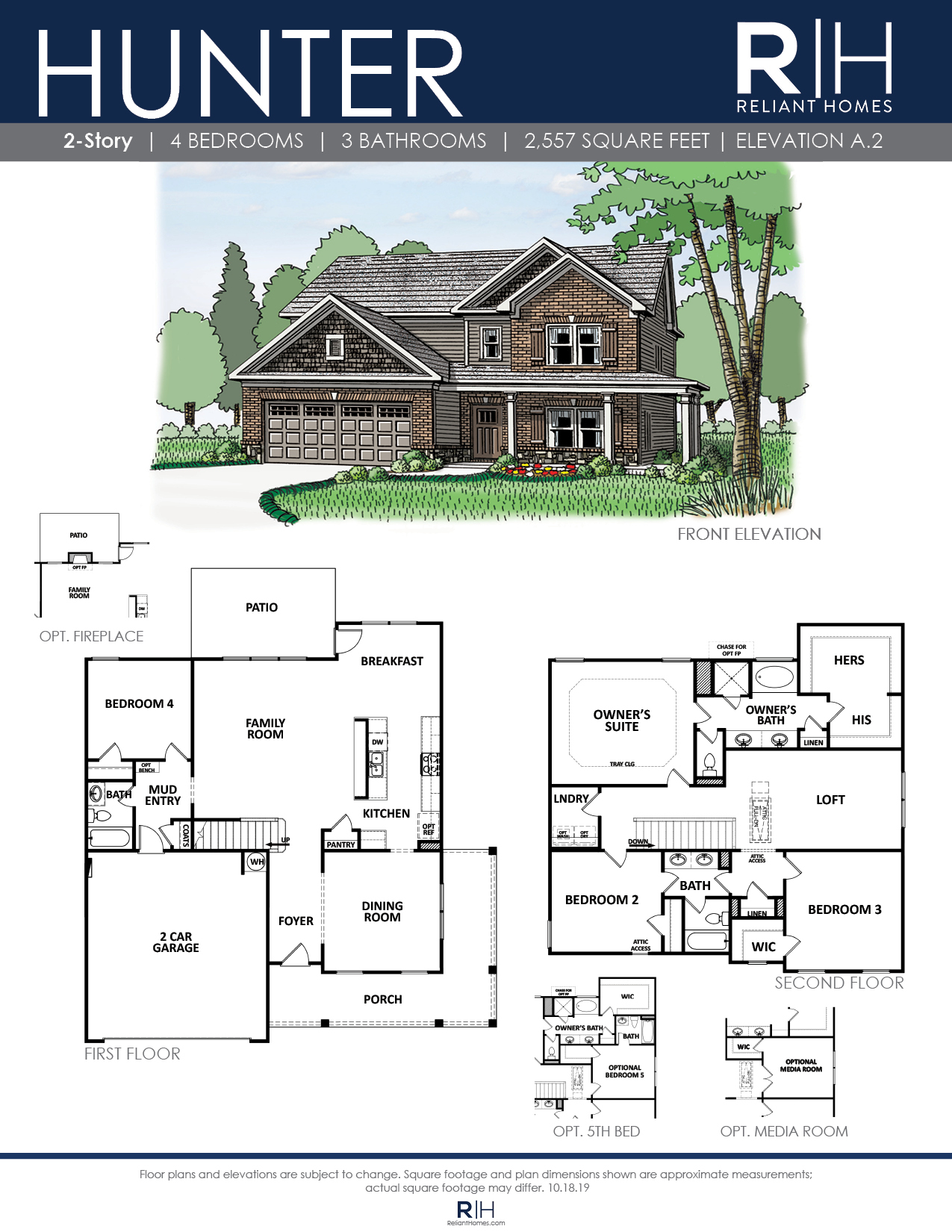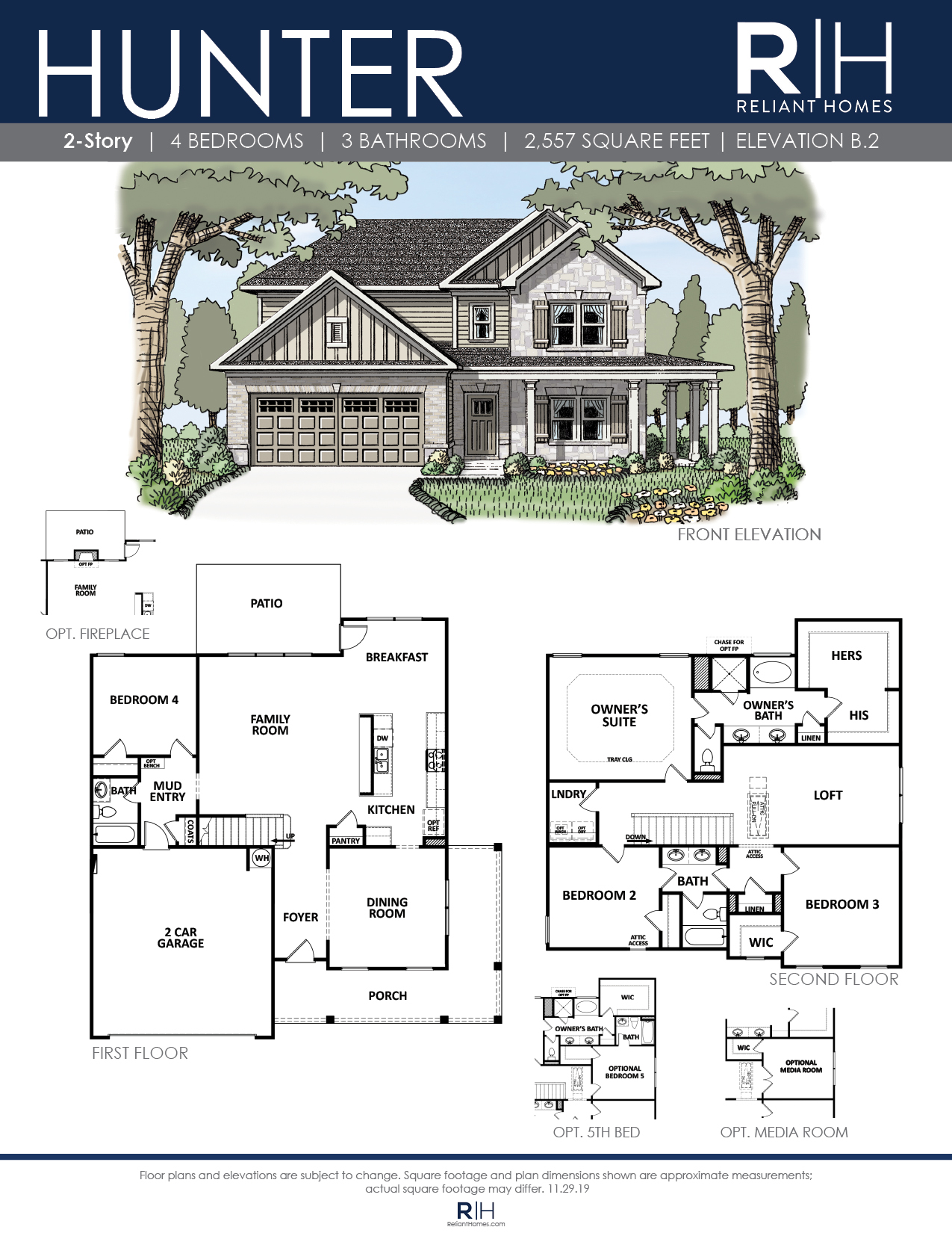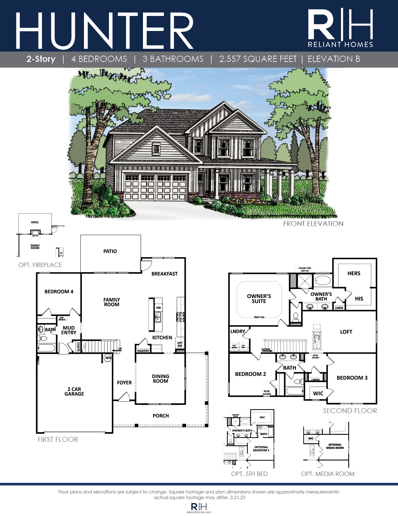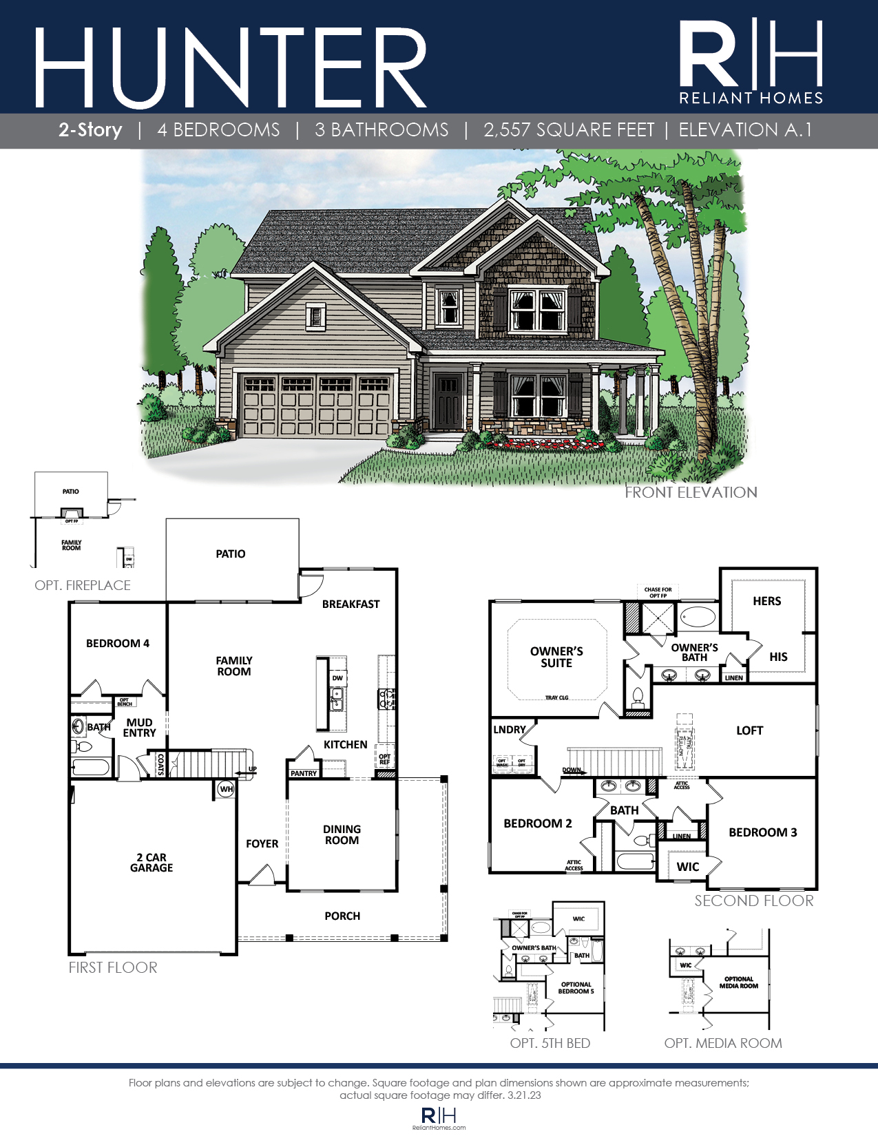 Beautiful 4 bedroom / 3 bath two story home with a welcoming wrap around porch. Bright entry leads to the dining and open concept living area. Chef’s kitchen with gourmet serving bar opens to the large family room with optional fireplace. The full bedroom and bath on the main level are perfect for guests. Upstairs, the Owner’s retreat features a tray ceiling, double vanity bath, separate tub and shower plus a lavish walk-in closet. The upper level has 2 additional bedrooms with a jack and jill bath and oversized loft for additional gatherings, or optional 5th bedroom.