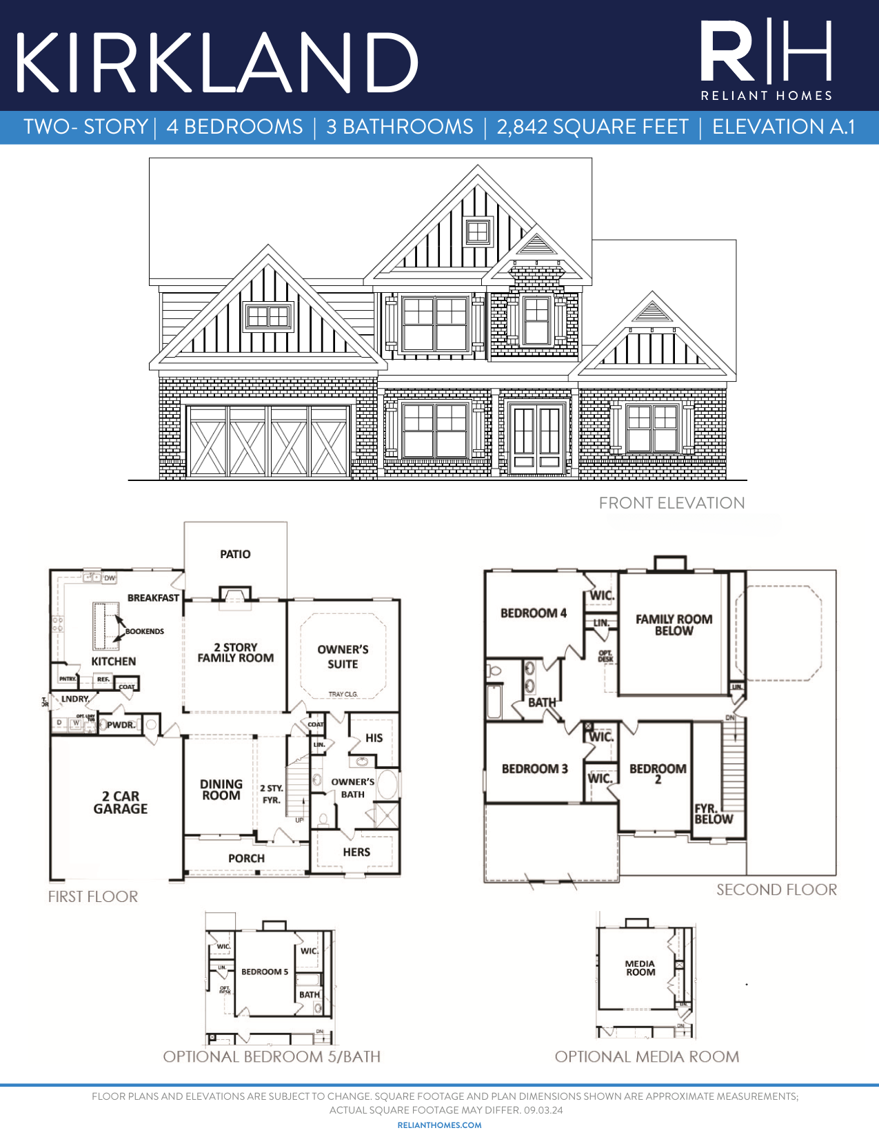 The Kirkland's open floorplan wows from the moment you walk in the front door. Its 2-story foyer guides you into the 2-story family room and open kitchen. The master suite is located on the main level and includes separate his/her closets. Three additional bedrooms are found upstairs, and an optional media room can replace the 2-story family room providing a great spot for your family to gather for a movie night or entertain guests.