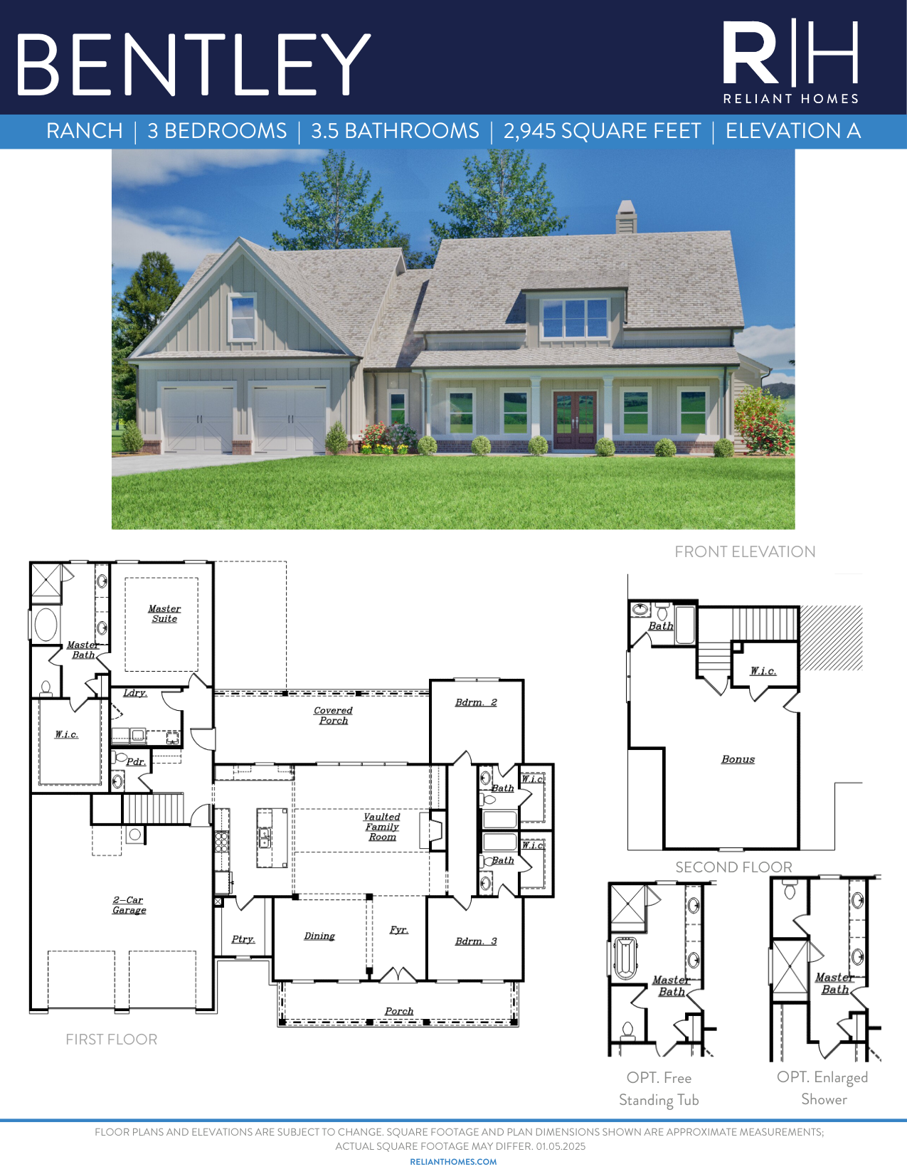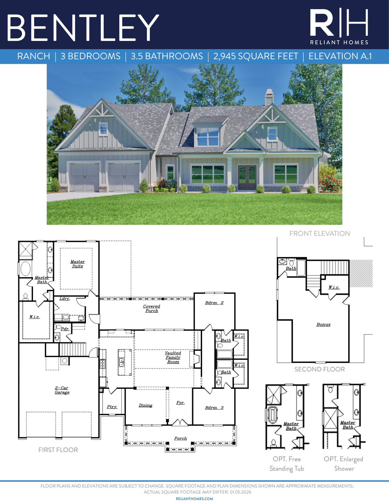 The Bentley plan blends comfort and functionality. This open-concept floor plan features a spacious family room that flows seamlessly into the kitchen, creating the perfect space for entertaining and everyday living. A large dining room offers plenty of space for hosting family gatherings and holiday meals. The main level includes a luxurious master suite with a generous walk-in closet, along with two additional bedrooms and two full bathrooms. Upstairs, you'll find a fourth bedroom with it's own bathroom — ideal for guests or a teen suite. The Bentley combines practical living with elegant touches, making it a perfect fit for families of all sizes.