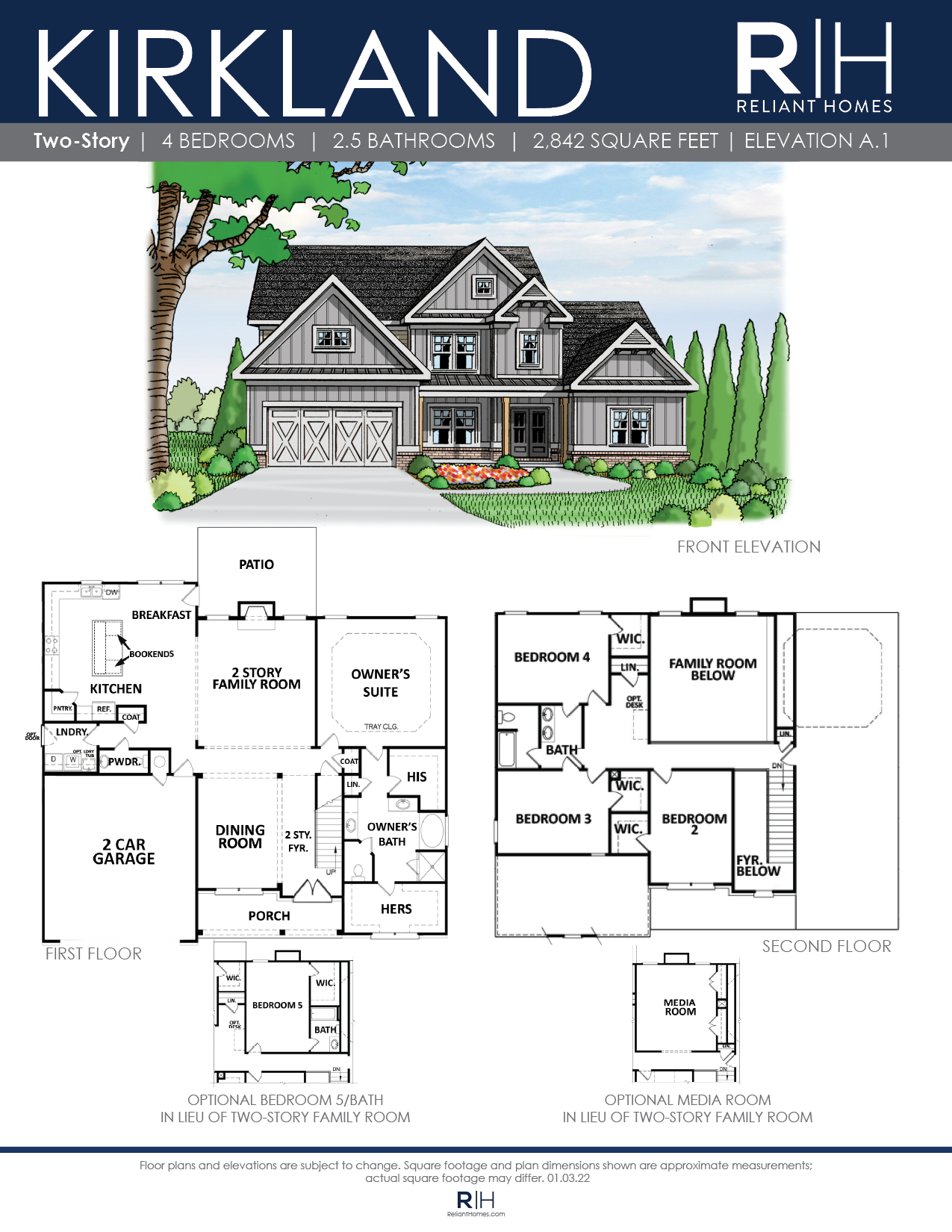 The Kirkland's open floorplan wows from the moment you walk in the front door. Its 2-story foyer guides you into the 2-story family room and open kitchen. The master suite is located on the main level and includes separate his/her closets. Three additional bedrooms are found upstairs, and an optional media room can replace the 2-story family room providing a great spot for your family to gather for a movie night or entertain guests.