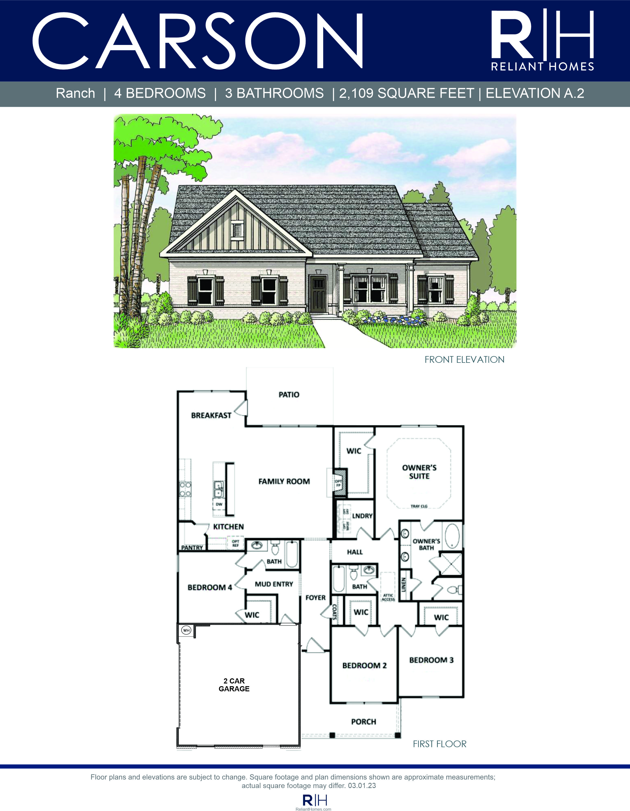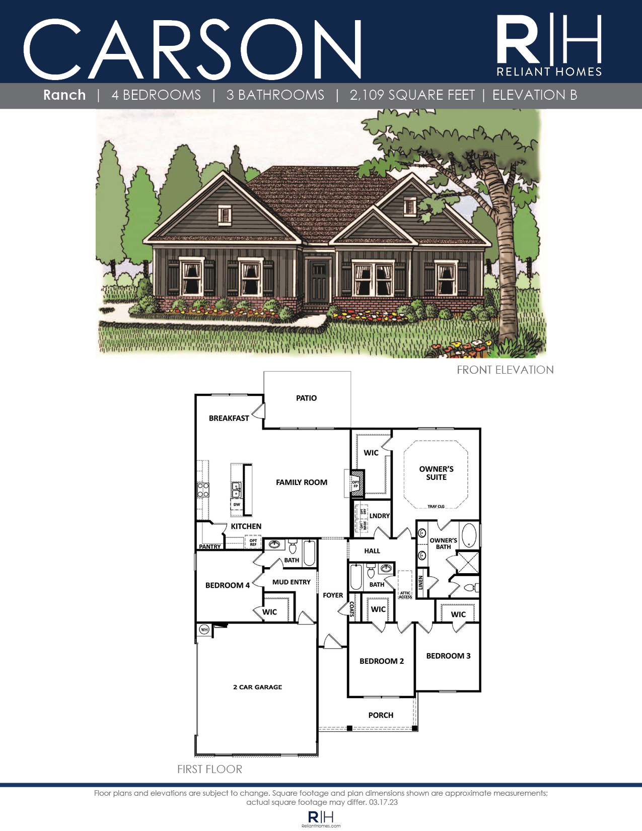 Exceptional ranch home with a 4 bedroom design that features a guest room with full bath plus 2 additional bedrooms and bath on the main level. The Owner’s retreat is privately situated in the rear of the home with a double vanity, separate tub and shower and walk-in closet. The generous family room opens to the kitchen and breakfast with lots of windows, open serving bar, and pantry. This plan offers the option of a family room fireplace and mud bench!