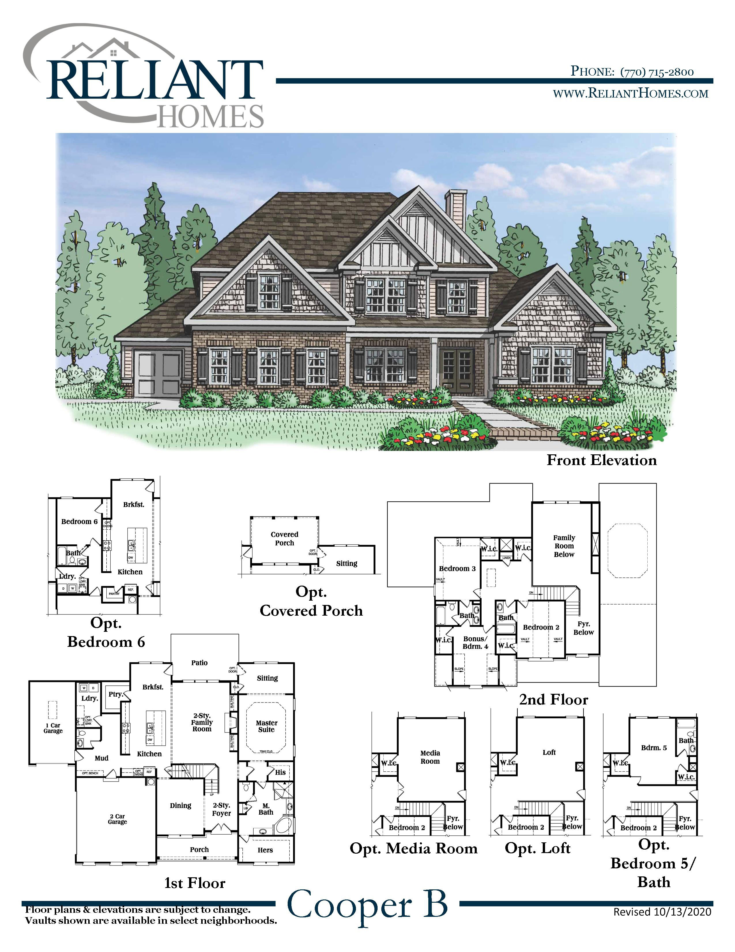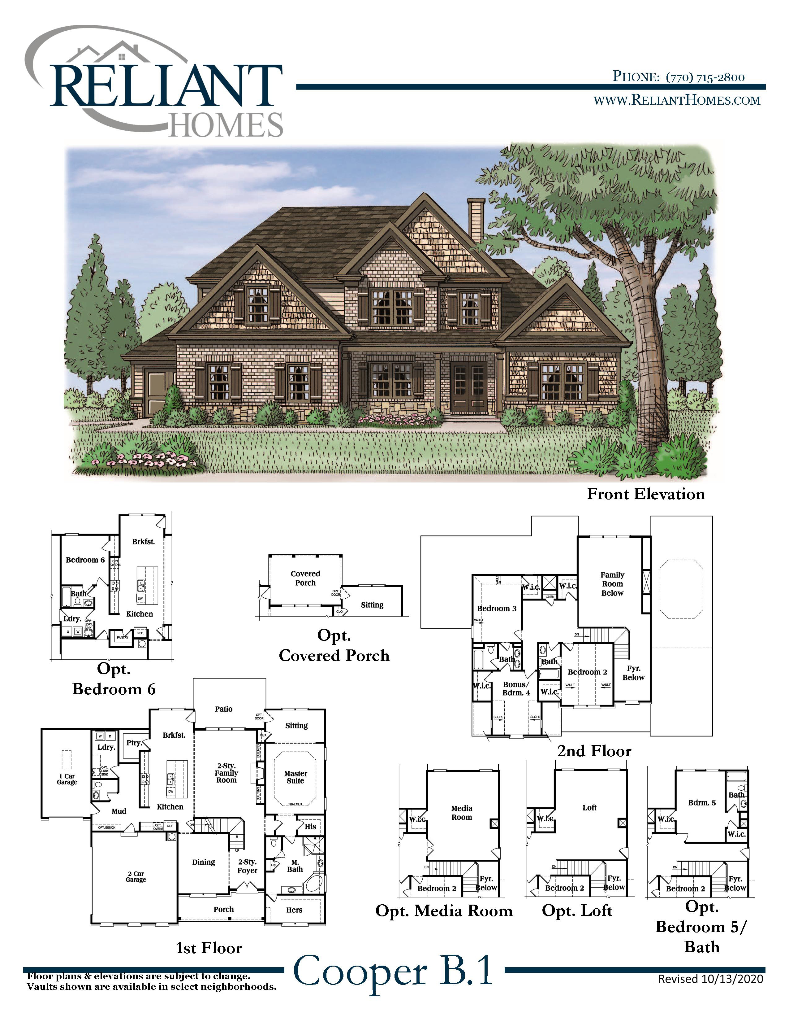The Cooper floor plan boasts an open layout with master suite on main. The over-sized master suite includes an additional sitting room and separate his/her walk-in closets. The master bath includes a dual vanity, walk-in shower, and separate garden tub. The gourmet kitchen features a grand island with knee-space for gathering. The laundry room is also located on the main level. Upstairs, you'll discover three additional bedrooms with two full bathrooms. A spacious loft is included upstairs and, as an option, can be enclosed to create a media room. As another option, add a guest bedroom and bath or study on the main.