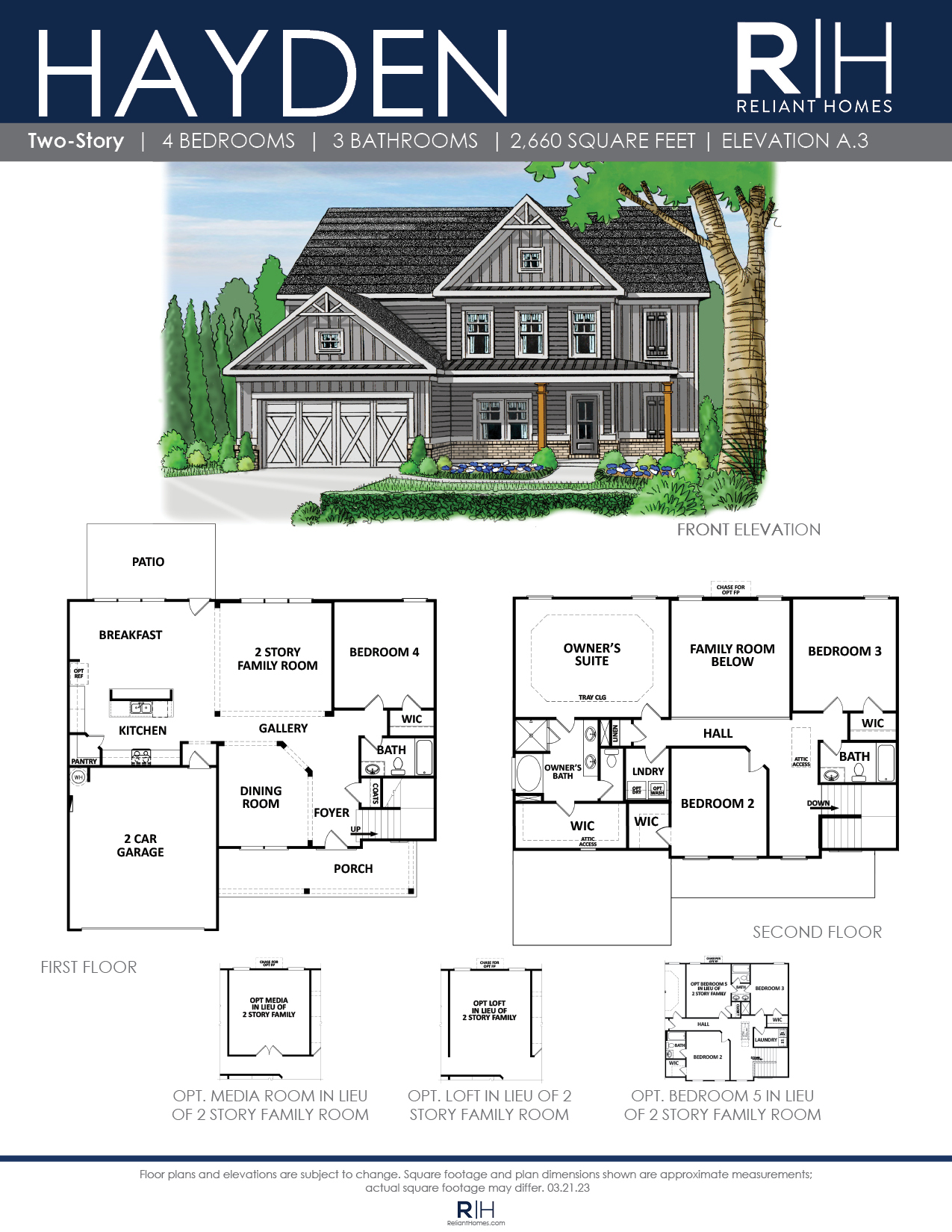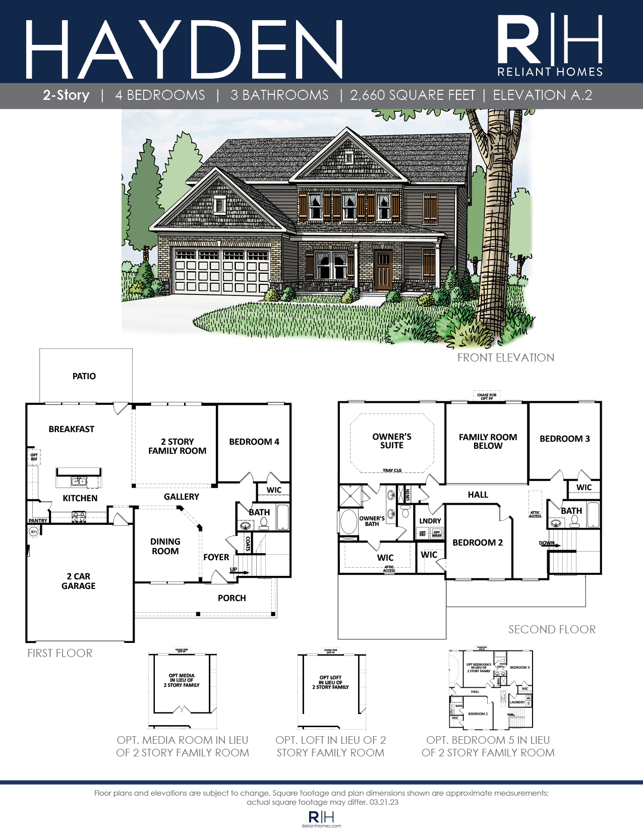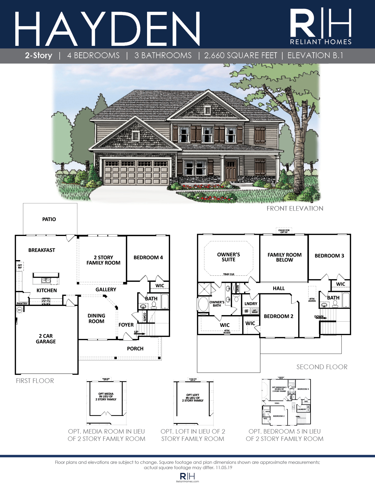 A distinctive 4 bedroom home with a formal dining room and Guest suite on the main level. The grand 2-story family room has an optional fireplace and is open to the kitchen and breakfast. Upstairs the Owner’s suite features a tray ceiling, double vanity bath with separate tub and shower and large walk-in closet. This home comes with 2 additional bedrooms upstairs and a full bath. For more flexibility, this plan has the option upstairs for a media room, loft or an additional 5th bedroom and bath.