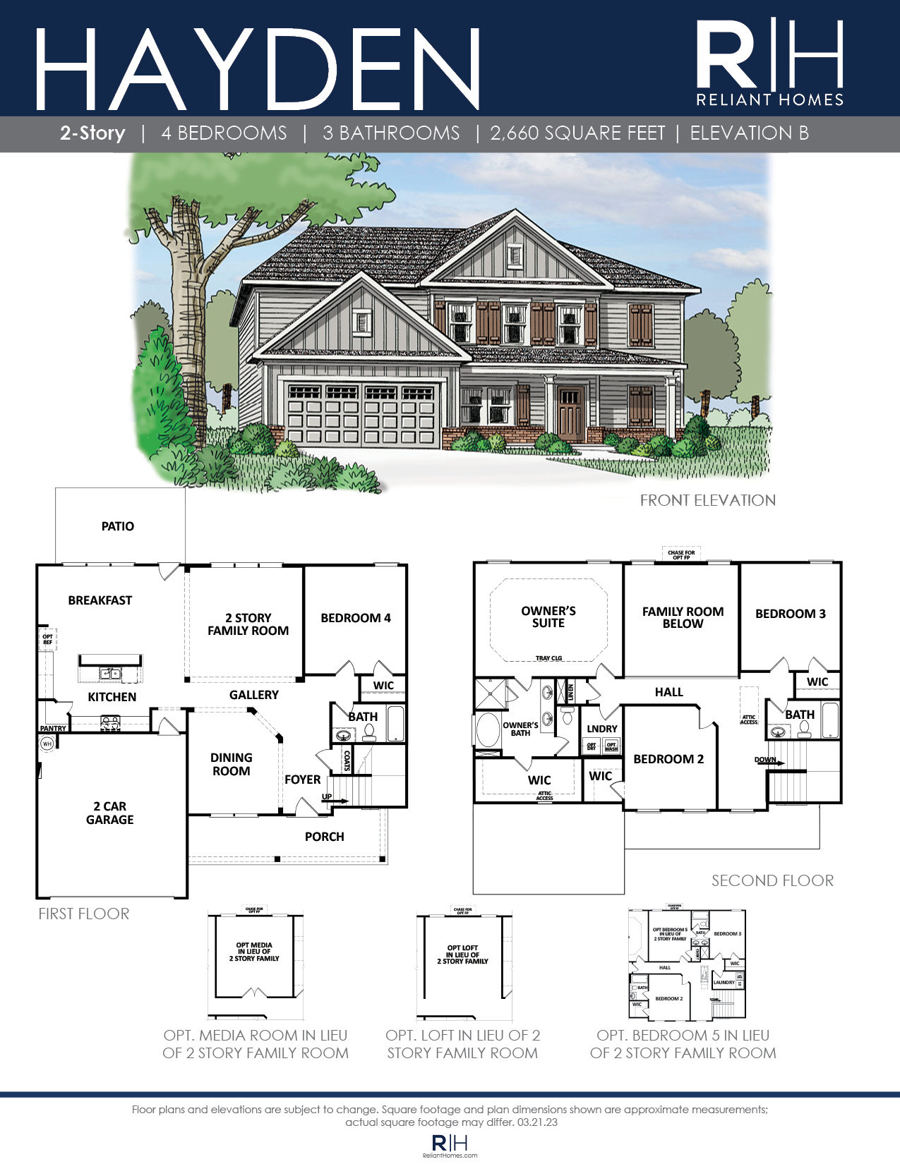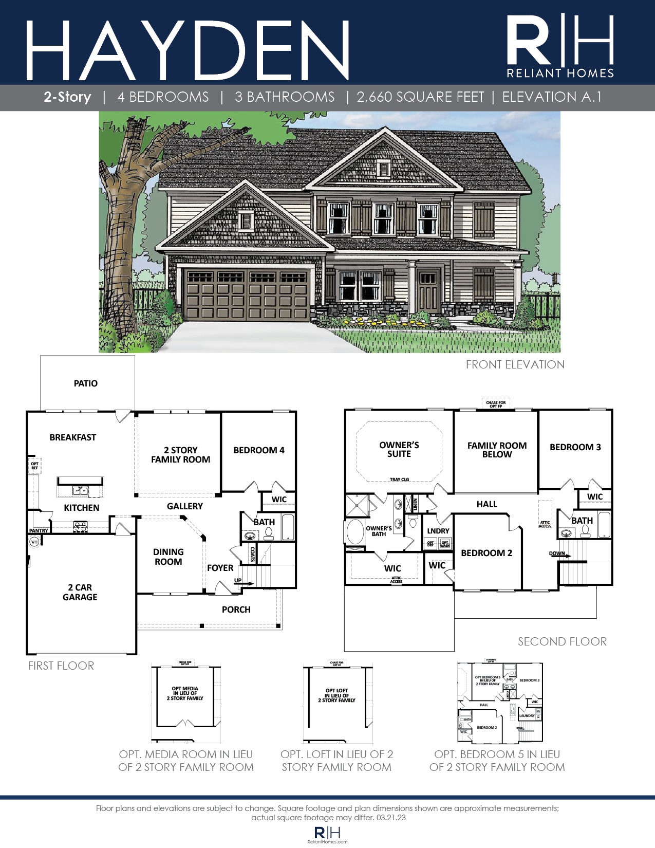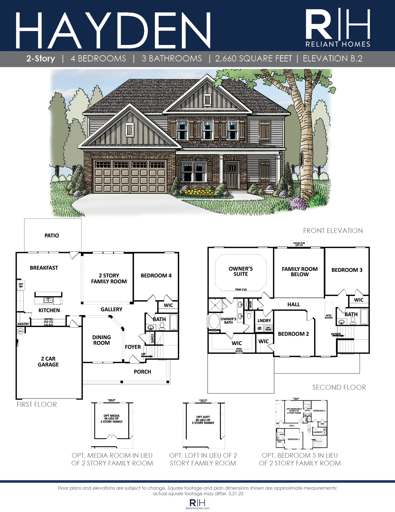 A distinctive 4 bedroom home with a formal dining room and Guest suite on the main level. The grand 2-story family room has an optional fireplace and is open to the kitchen and breakfast. Upstairs the Owner’s suite features a tray ceiling, double vanity bath with separate tub and shower and large walk-in closet. This home comes with 2 additional bedrooms upstairs and a full bath. For more flexibility, this plan has the option upstairs for a media room, loft or an additional 5th bedroom and bath.