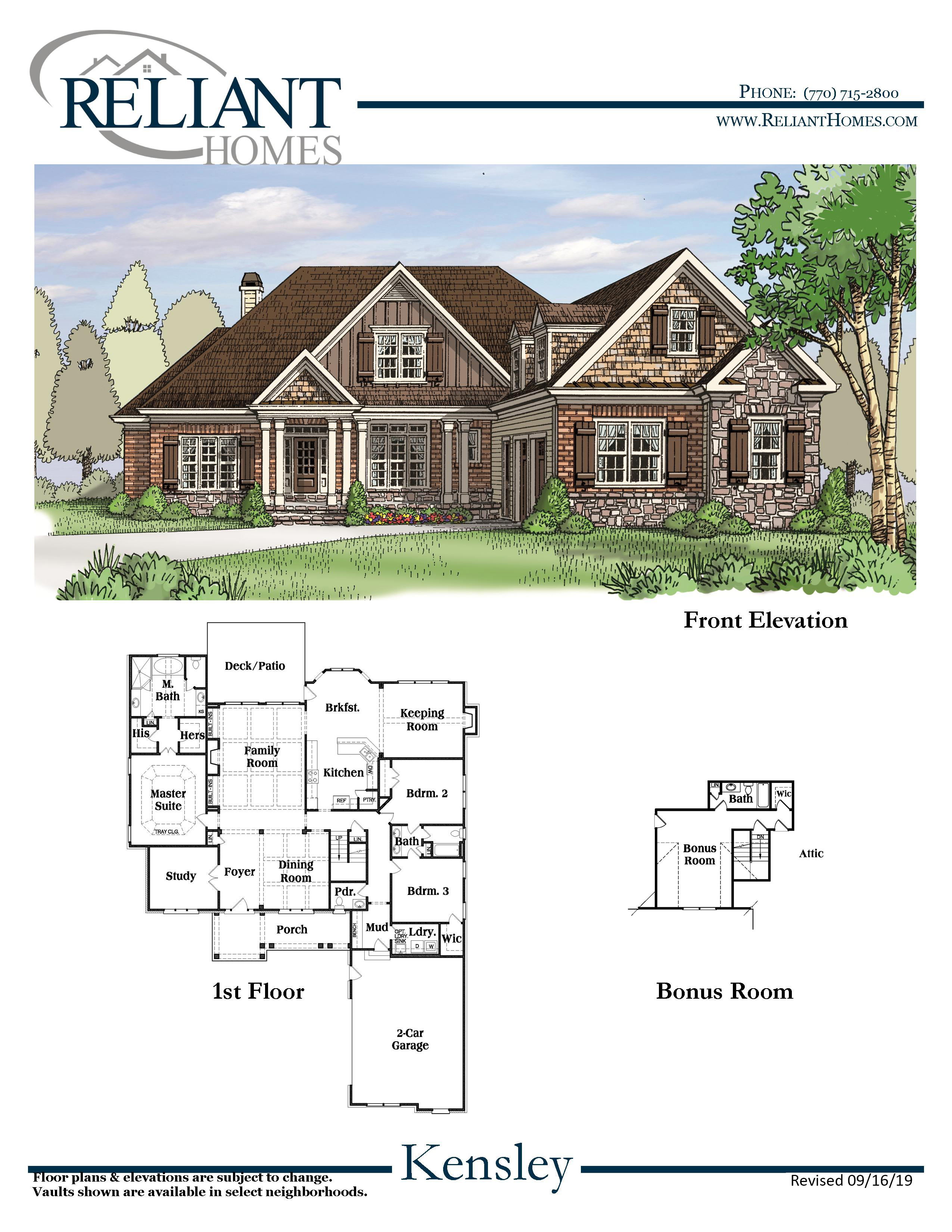 The Kensley is a gorgeous courtyard, ranch plan, that comes equipped with it all! The main level is a split floor plan, with the owner suite on one side of the home, and two additional bedrooms on the opposite side. The oversized owner suite offers two separate walk-in closets and massive bath, with separate shower, garden tub and two vanities. The gourmet kitchen includes a separate breakfast area that opens into the vaulted keeping room with fireplace. This plan has a separate, substantial family room, featuring its own fireplace, as well as, a designated dining room. Upstairs, you have a generous bonus room with a walk-in closet and full bath. Also, there is a study/office, on the main level, which completes this incredible home!