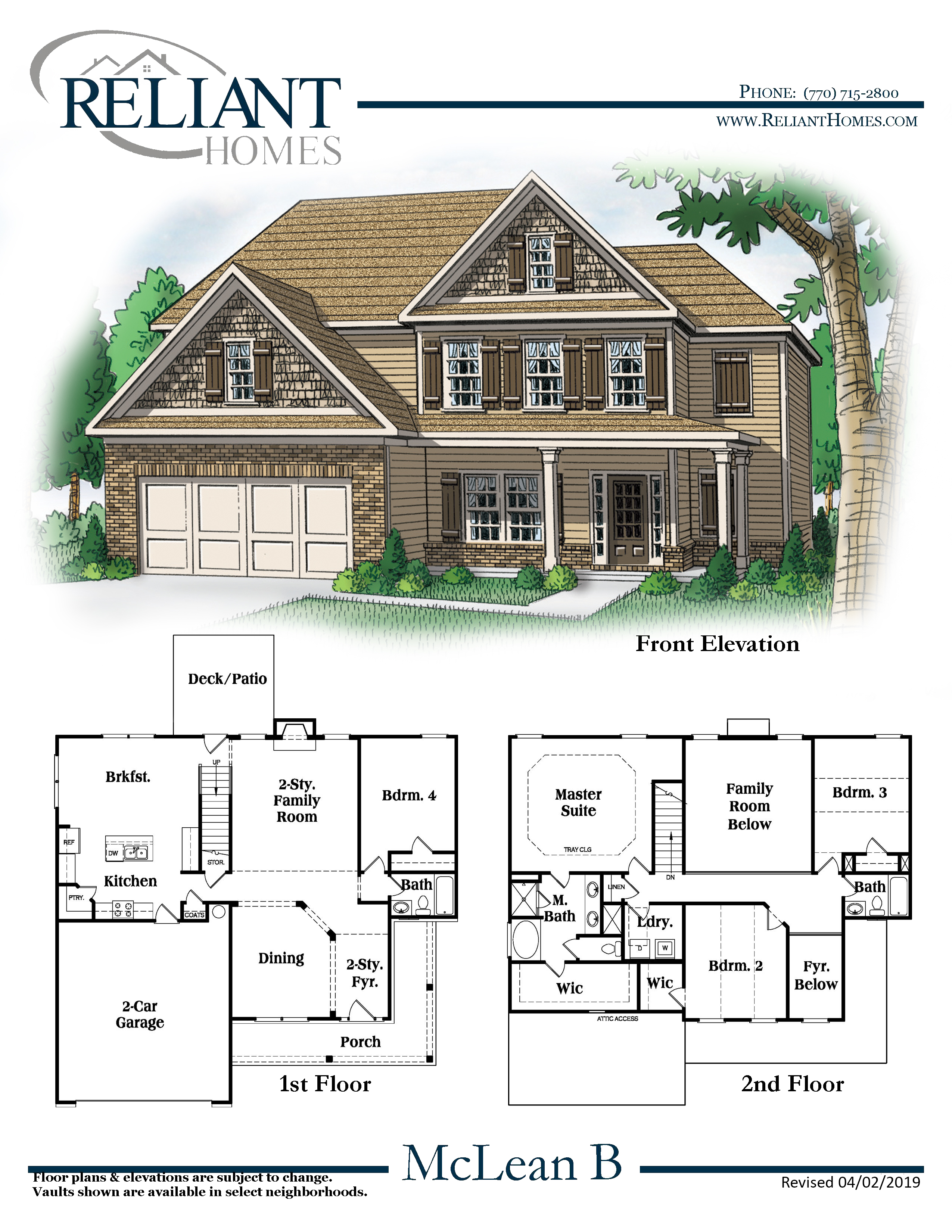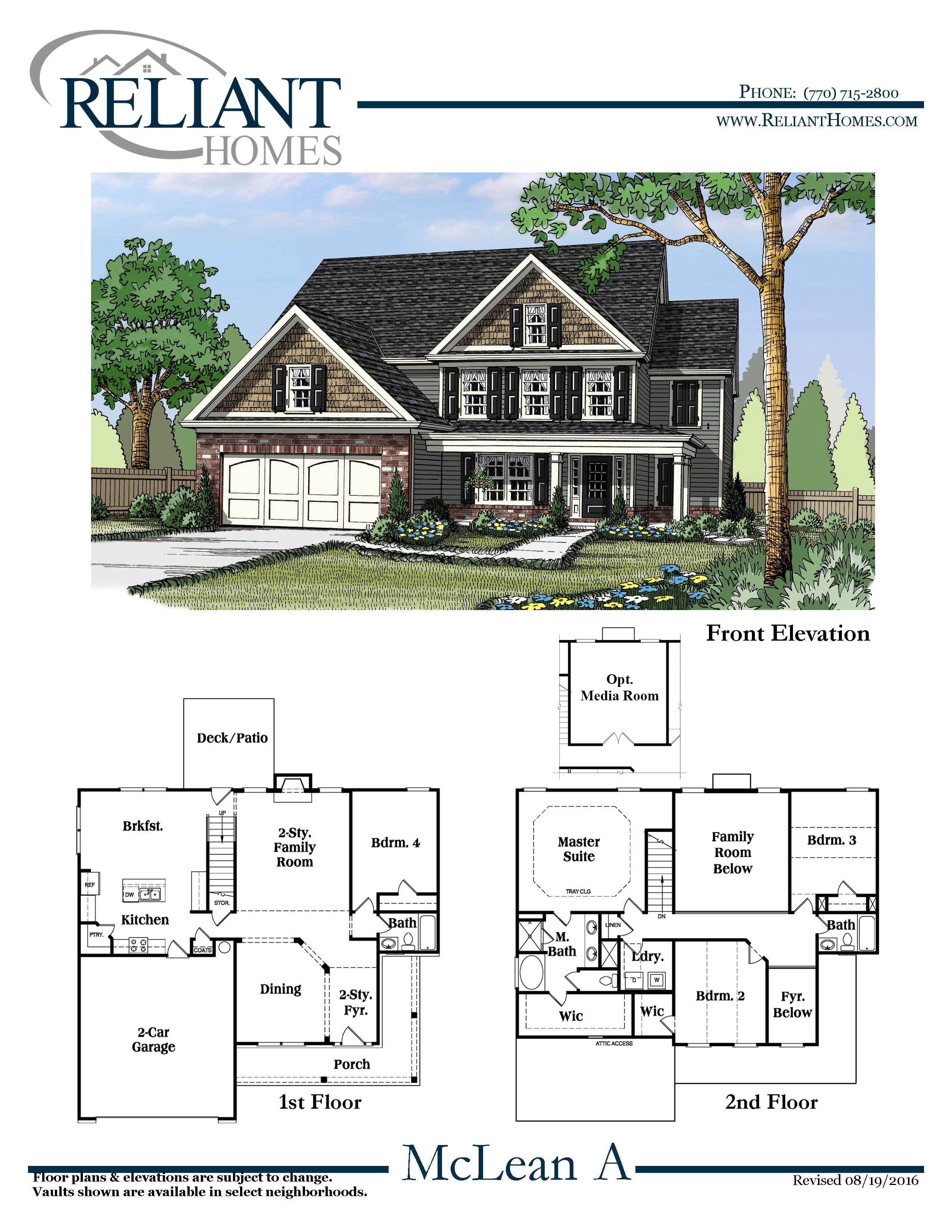 The McLean's unique design includes a guest bedroom on the main floor with an attached full bath. The breakfast area is adjacent to the spacious kitchen with a large pantry. The two-story family room is next to the separate formal dining room and open two-story foyer. The master suite is on the second floor and features a separate sitting area and huge walk-in closet. There are two additional bedrooms on the second level along with a separate bath.