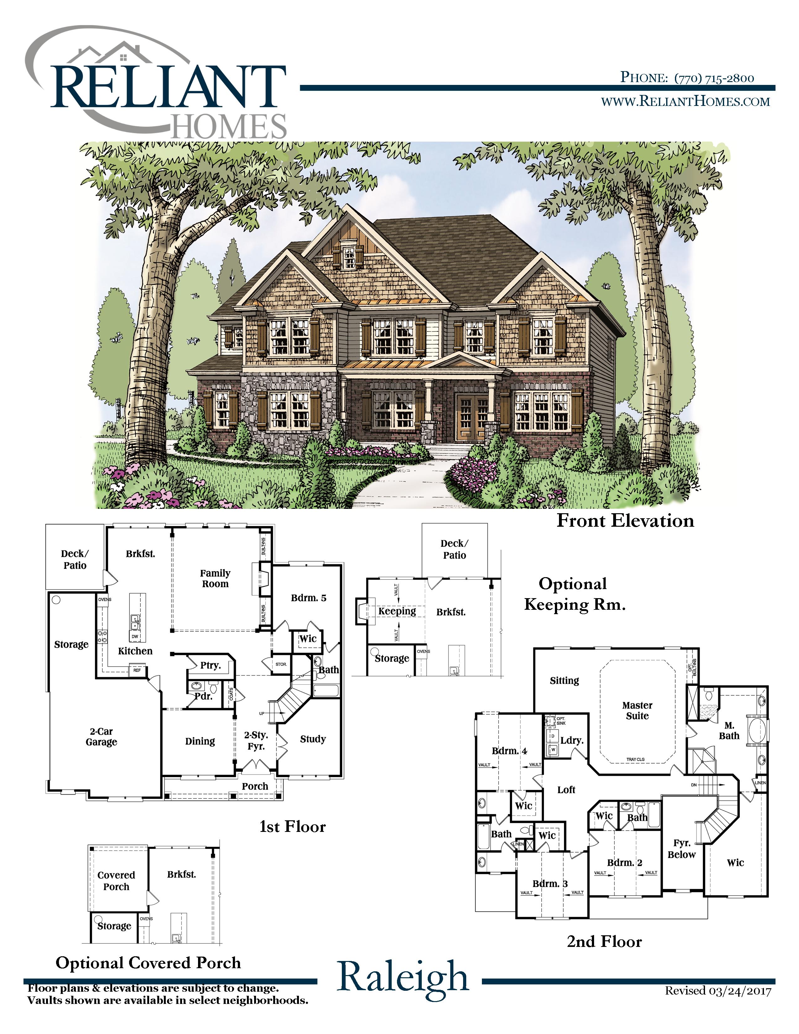 The spacious Raleigh plan features a guest bedroom/bath on main in addition to a large study. The open kitchen flows into the family room and includes a large walk-in pantry. The master suite with sitting room is on the 2nd level; the master bath includes separate his/her vanities along with a substantially sized walk-in closet. Three additional bedrooms are also found upstairs; one with private bath access and the other two with shared bath access.
