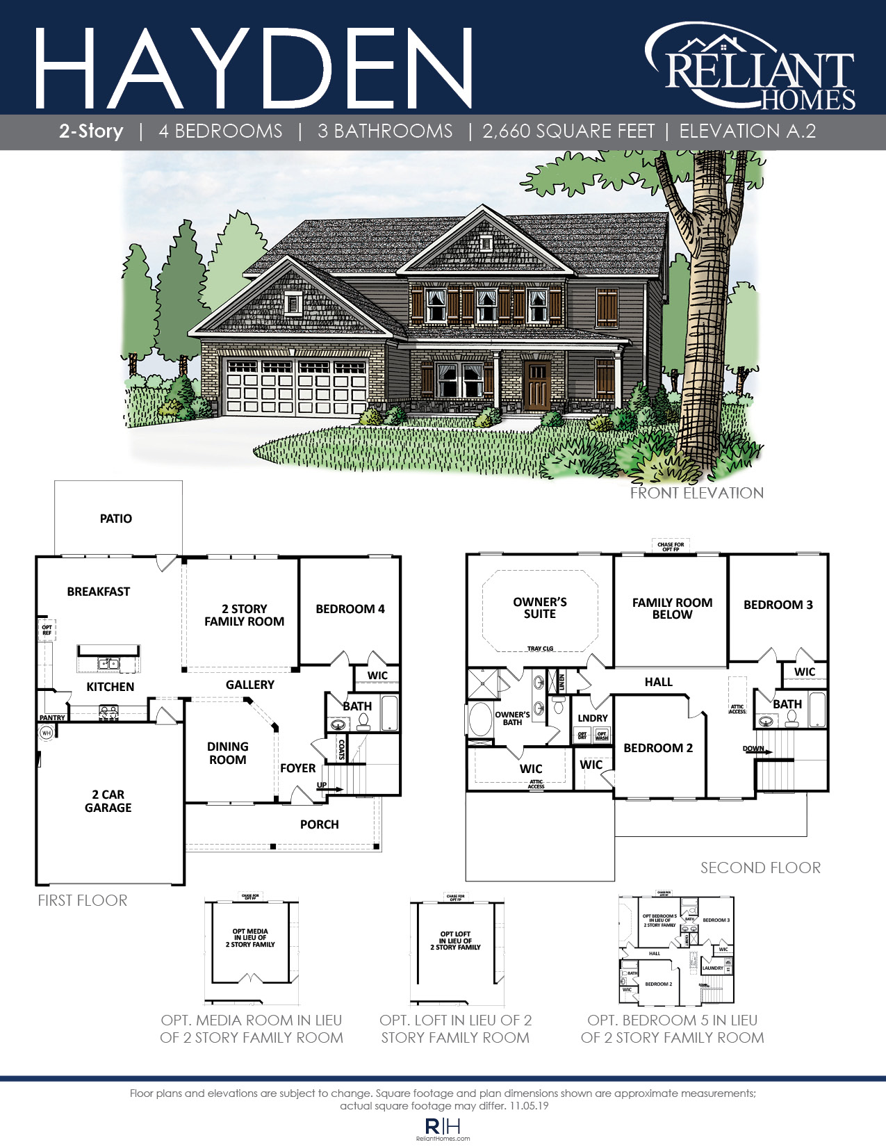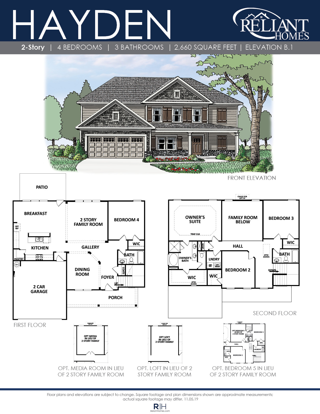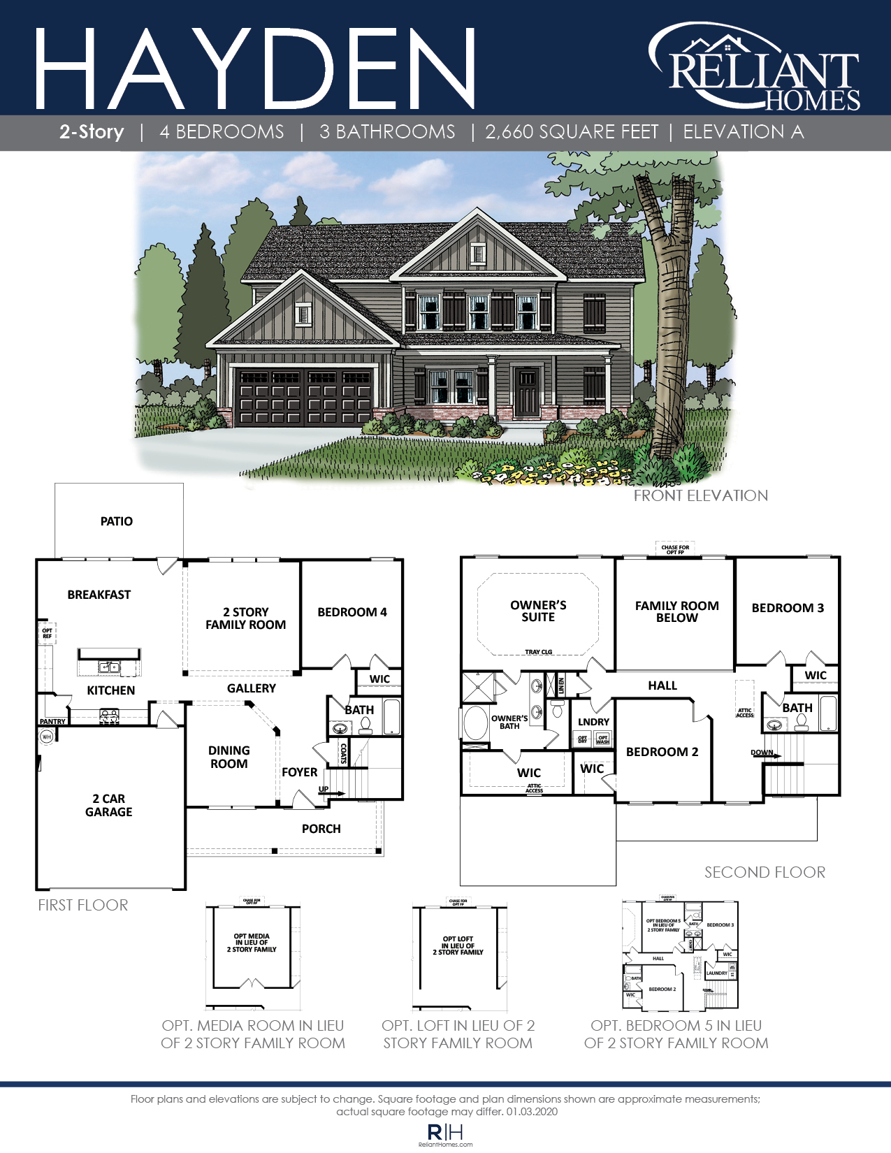 A distinctive 4 bedroom home with a formal dining room and guest suite on the main level. The grand 2-story family room has an optional fireplace and is open to the kitchen and breakfast. Upstairs the Owner’s suite features a tray ceiling, double vanity bath with separate tub and shower and large walk-in closet. This home comes with 2 additional bedrooms upstairs and a full bath. For more flexibility, this plan has the option upstairs for a media room, loft or an additional 5th bedroom and bath.