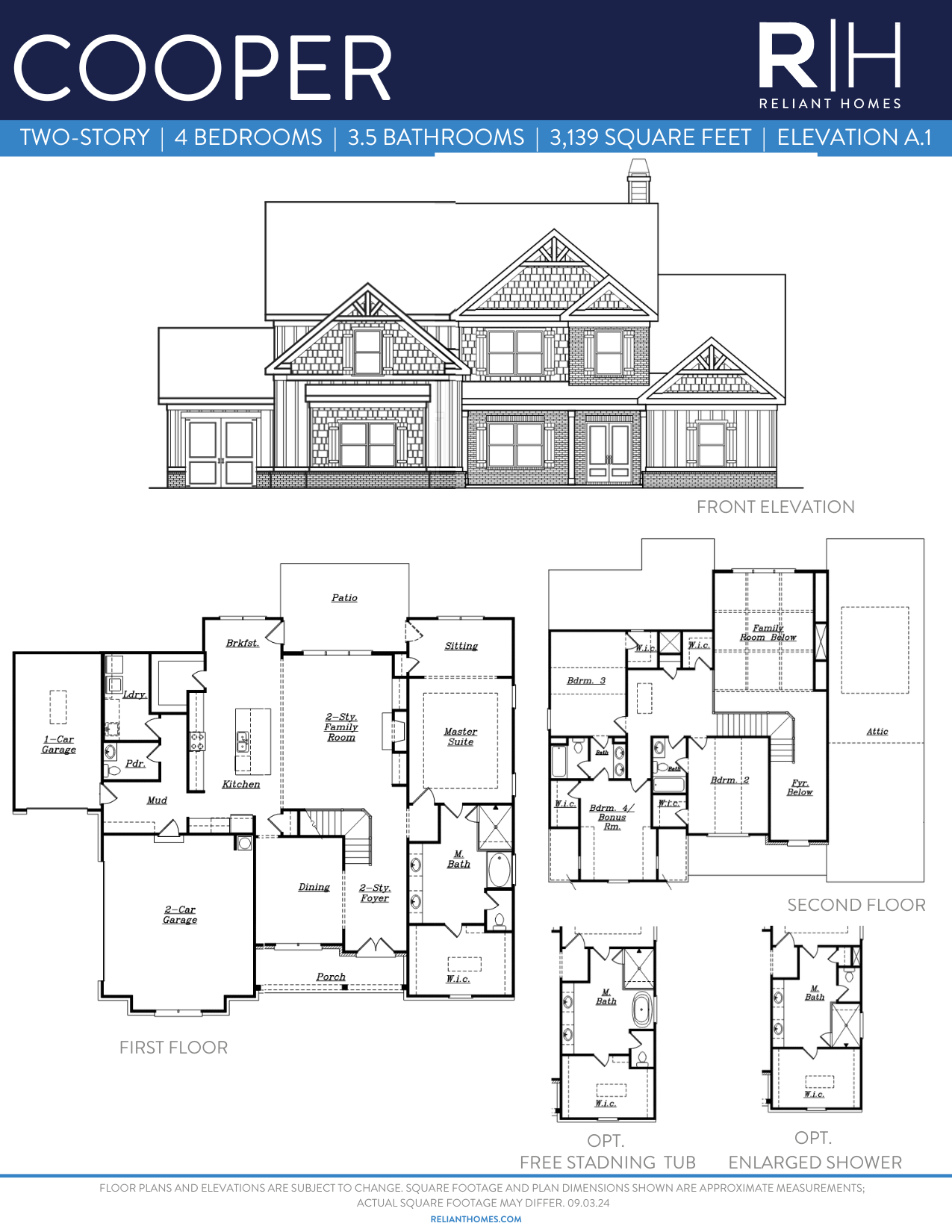 The Cooper floor plan boasts an open layout with master suite on main. The over-sized master suite includes an additional sitting room and separate his/her walk-in closets. The master bath includes a dual vanity, walk-in shower, and separate garden tub. The gourmet kitchen features a grand island with knee-space for gathering. The laundry room is also located on the main level. Upstairs, you'll discover three additional bedrooms with two full bathrooms. A spacious loft is included upstairs and, as an option, can be enclosed to create a media room. As another option, add a guest bedroom and bath or study on the main.